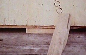 Dies ist derselbe Keil, nur anders hingelegt. Würde man damit eine Kiste sichern, müsste in das Hirnholz genagelt werden. Der Keil würde bereits beim Nageln oder einem der nächsten Transportstöße aufspalten. Versuche haben gezeigt, dass etwa nur die Hälfte der Widerstandswerte erreicht werden, als würde der Keil richtig benutzt.