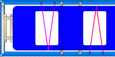 oben und Ausschnittvergrößerung unten: Sicherung mit Holzpallungen in Längsrichtung und je zwei Umspannungen zu den Seiten. Enden der Umspannungen auf einen Zurrpunkt gesetzt. |