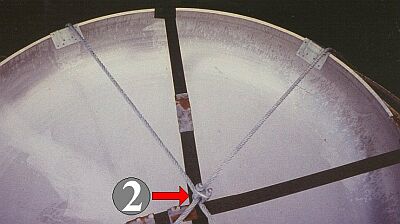 Die Stahldrahtseile sind überdies mangelhaft vorgespannt. Die sanften Rundungen an den Umlenkstellen lassen das gut erkennen. Gerade bei der gewählten Methode des Niederzurrens ist eine ausreichende Vorspannung unabdingbar. Die besonderen Eigenschaften von Stahldrahtseilen lassen in jedem Fall ein Lockern der Zurrung während der Reise erwarten. Auf die speziellen Anmerkungen unter dem Abschnitt Laschmaterialien sei hingewiesen.