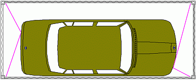 Die Position der Zurrpunkte am Fahrzeug ist in der Darstellung ideal. In der Praxis finden sich diese zumeist nicht in dieser Position. Um derart gleichmäßige Zurrwinkel zu erreichen, müssten die Befestigungspunkte bei Fahrzeugen mit Linkslenkung vorn und hinten symmetrisch etwas außermittig zur linken Fahrzeugseite angebracht sein. Bei Fahrzeugen mit Rechtsteuerung, die an die linke Containerwand gefahren werden müssten, wären die Zurrpunkte am Fahrzeug etwas rechts von der Mitte anzuordnen.