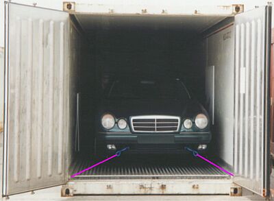 Personenkraftwagen in Containern Gegenüber anderen Gütern sind Pkw im Container als sehr leichte Ladungen zu betrachten. Im Verhältnis zur Nutzlast der Container betragen die Massen der Pkw nur einen Bruchteil. Die Gummibereifung ist für die Ladungssicherung von großem Vorteil - kann doch in Abhängigkeit von den Containerböden mit Gleitreibbeiwerten von mindestens μ = 0,4 bis zu μ = 0,8 gerechnet werden. Selbst bei angenommenen Beschleunigungen von 1 g in Längs- und Querrichtung wären pro Tonne Ladungsmasse nur Sicherungskräfte in Höhe von 200-600 daN erforderlich. Was den Punkt "Ladetüchtigkeit der Container" betrifft, ist insbesondere darauf zu achten, dass sich im oder am Boden keinerlei scharfkantige oder spitze Gegenstände befinden, die eine Beschädigung von Reifen zur Folge haben könnten. Jegliche Materialien, die einen größeren Feuchtigkeitsgehalt besitzen, wie z. B. Hölzer u. Ä., sollten sich nicht mit im Container befinden. Durch Kondensationserscheinungen könnten Polster u. Ä. schimmelig werden oder andere Kondensationsschäden entstehen. Beim Öffnen von mit Straßenfahrzeugen beladenen Containern sollte darauf geachtet werden, dass keine Funken entstehen oder offene Flammen in der Nähe sind. Durch ausgetretenen Kraftstoff könnte sich ein zündfähiges Gemisch im Container befinden. Deshalb sollten derartige Container erst nach gründlicher Belüftung betreten werden. Werden Fahrzeuge direkt in die Container gefahren, muss Platz zum Aus- und Einsteigen verbleiben. Die Fahrzeuge müssen deshalb relativ dicht an eine der Containerwände herangefahren werden - bei Fahrzeugen mit Linkssteuerung an die rechte Containerseitenwand. Allerdings muss der Abstand so groß sein, dass eine Berührung der Containerwände auch bei schwingendem Fahrzeugaufbau ausgeschlossen bleibt.
