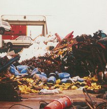 In the lower container (1), the poorly secured machine has been set in motion and has forced the container doors open. The tank on the platform (2) stowed above is secured with only two belts and thus also inadequately. Nevertheless, it has withstood the acceleration forces and has slipped only a little. This is a clear indication that the acceleration forces were still relatively slight. The following pictures clearly show the results of home-grown acceleration forces. It should be noted that almost all of the containers have been exposed to stresses from the inside outwards, i.e. they have bulges rather than dents.
