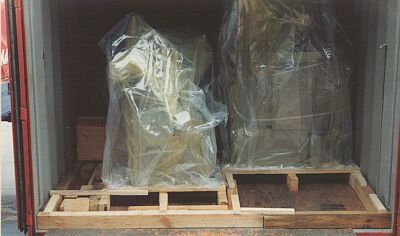 The film has been damaged by introduction of the cargo, through being walked over by the loading personnel and by nailing of the joists and securing lumber to the container floor and it therefore no longer functions as a barrier. Even if the barrier were still intact, the lumber introduced in large quantities is such a source of moisture that the water vapor released by it could only be absorbed if enormous quantities of desiccants were introduced. Only if kiln dry lumber is used and it can be guaranteed that the barrier remains undamaged can reliable corrosion protection be achieved in this manner. The following details relate only to mechanical cargo securing, irrespective of the efficacy of any attempts to achieve corrosion protection. Lining of the container with film makes all the lashing points inaccessible. The remaining cargo securing options are therefore primarily only compact loading and gap filling. As a secondary option, lashings can be attached to the fixed lumber or wooden frames. The switch cabinet is not yet secured. The gap can be filled with cargo, braced or closed up with airbags.