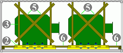 When producing the package bases, care must be taken to ensure that the bottom joists run lengthwise, so that the cargo weight can be transmitted uniformly to the container bottom cross members. Appropriately cut squared lumber is laid across the package bases or frames at several points (2). "Shoring" (3) is fitted between this lumber and the container's top side rails and knocked outwards slightly in the bottom area in order to exert sufficient pressure on the "wooden pressure members" (2). Finally, "wooden securing members" (4) are nailed on, with the purpose of holding the shoring in place throughout the journey. If there is concern that shoring may shift in the longitudinal direction, it may be stopped from doing this by nailing wooden bars on to it. Better results can be achieved with wood connectors. However, using wood connectors is more expensive with regard to nailing, since thought has also to be given to removal of the cargo from the container - detaching wood connectors is more difficult than detaching boards.