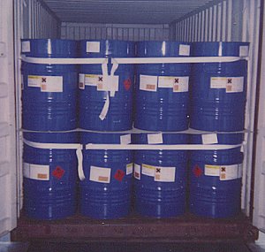The wording "packing a container with barrels on pallets" has been chosen deliberately, as the barrels have not been palletized, for which they would have had to have been firmly connected to the pallet. Here, the pallets serve on the one hand to rationalize handling and on the other hand as floor and interlayer dunnage. Care is recommended if the dimensions of the barrels do not exactly match those of the container, since stowage gaps are then left which absolutely must be adequately filled.