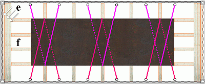 To this end, crosspieces (e) are placed against both end walls to distribute pressure and lengthwise wooden members (f) are inserted between these crosspieces and the slab and are nailed to the lattice members beneath.