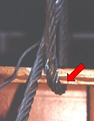 Too few wire clips have been used. Some of them have also be placed on the wrong side. Spacing between the clamps is inadequate. The tightening moment is too low. Only if four wire clips are correctly applied and properly tightened can the maximum securing load of the wire ropes and turnbuckles be fully utilized.