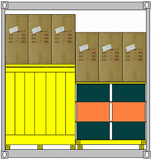 The heavy wooden case is stowed tightly against the left-hand container wall. At floor level it is supported against the right-hand container side wall by wooden bracing. The barrels are loaded onto this bracing. Any remaining gaps are filled with material of sufficient loading capacity. Interlayer dunnage of wooden boards or the like is placed on the barrels, which additionally secures the case in the upper area against tipping forces and provides a clean supporting surface for the cartons to be loaded thereafter in stepped arrangement.