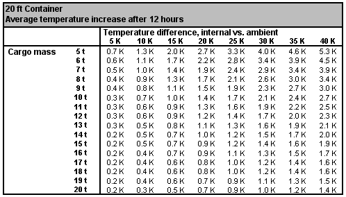 | For a rule of thumb calculation of the increase in temperature of the cargo in the container, it is assumed that the entire cargo increases in temperature at the same rate without the formation of any local temperature differences. A calculation of this nature therefore does not take into account in particular the temperature layering that occurs in a container as a result of long periods of standstill. For the temperature increase over time t, the following equation applies for non-respiring goods (goods with no respiration heat)